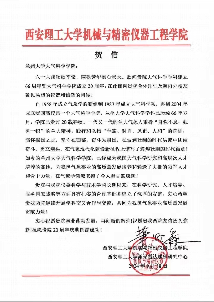 西安理工大学机械与精密仪器工程学院、西安理工大学激光雷达遥感研究中心致best365官方网站登录入口建院20周年贺信