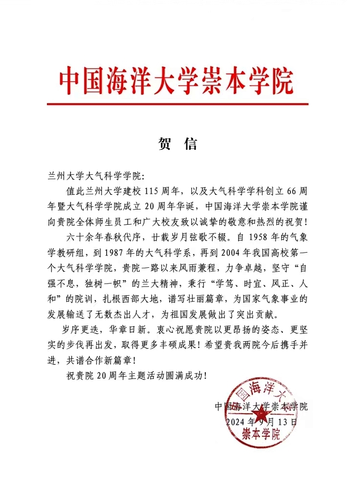 中国海洋大学崇本学院致best365官方网站登录入口建院20周年贺信