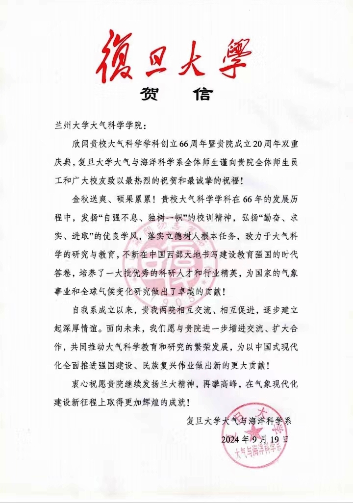 复旦大学大气与海洋科学系致best365官方网站登录入口建院20周年贺信