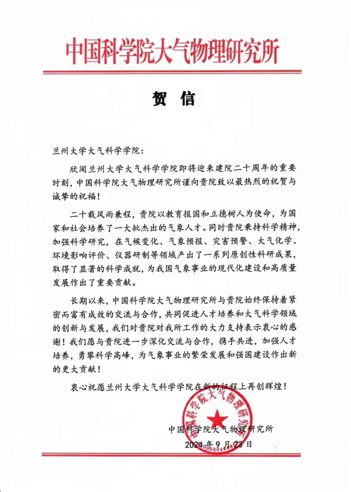 中国科学院大气物理研究所致best365官方网站登录入口建院20周年贺信