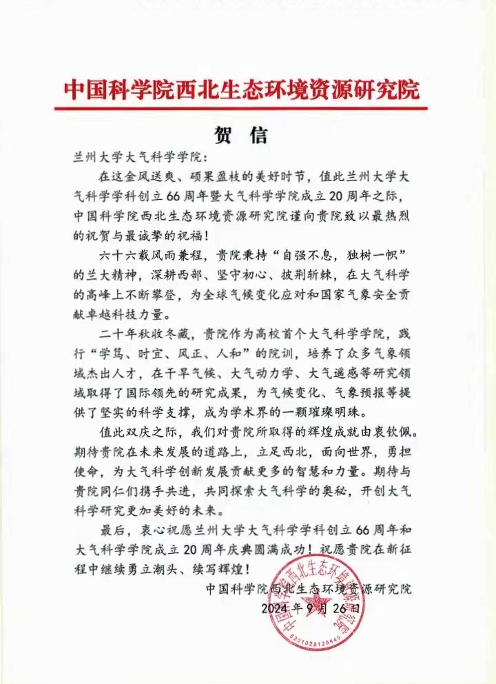 中国科学院西北生态环境资源研究院致best365官方网站登录入口建院20周年贺信